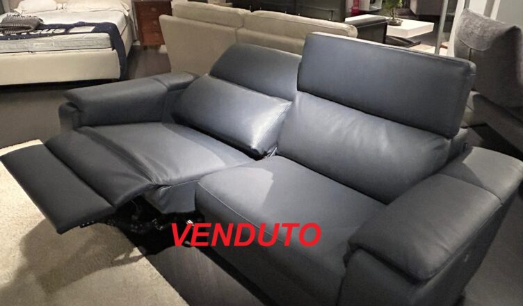 Divano 3posti con 2 Recliner motorizzati elettricamente 205cm e prof 99cm in Pelle Torello color Blu (non sfoderabile). Dotato di 2 meccanismi recliner motorizzati elettricamente, azionabile mediante una pulsantiera posizionata nella parte esterna al fianco del bracciolo. La profondità massima del recliner aperto è di 156cm.